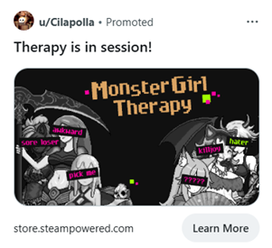 - Advertising is rarely a self-starter, and there are certainly games that are, well … more advertisable than others. I’m actually convinced of Monster Girl Therapy’s “advertising potential,” but I’ve also put quite a bit of energy into suitable promotional material. (Do you like it?)