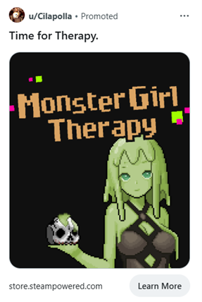 Ein seltsamer Effekt bei Monster Girl Therapy spezifisch: Ich denke, die Algorithmen mögen das Spiel durchaus, aber sie sind sich auch DEUTLICH bewusst, dass es zumindest oberflächlich mit der Ästhetik von Fan Service und Dating Sims herumspielt. Wenn ihr wüsstet, wie oft ein (völlig unschuldiger!) Post zu diesem Spiel als „NSFW“ geflagged wurde … =D Und das kann durchaus ein Problem sein, denn Reddit ist verdammt zimperlich, was „inappropriate“ in tatsächlicher Werbung angeht!